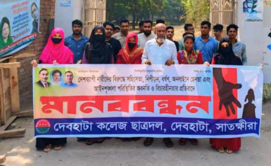 বাংলাদেশ জাতীয়বাদী ছাত্রদল কেন্দ্রঘোষিত কর্মসুচি দেশব্যাপী নারীদের বিরুদ্ধে সহিংসতা, নীপিড়ন,ধর্ষণ, অনলাইনে হেনস্থা আইনশৃঙ্খলা পরিস্থিতির অবনতি ও বিচারহীনতার প্রতিবাদে মানববন্ধন করেছে দেবহাটা কলেজ শাখা ছাত্রদল।