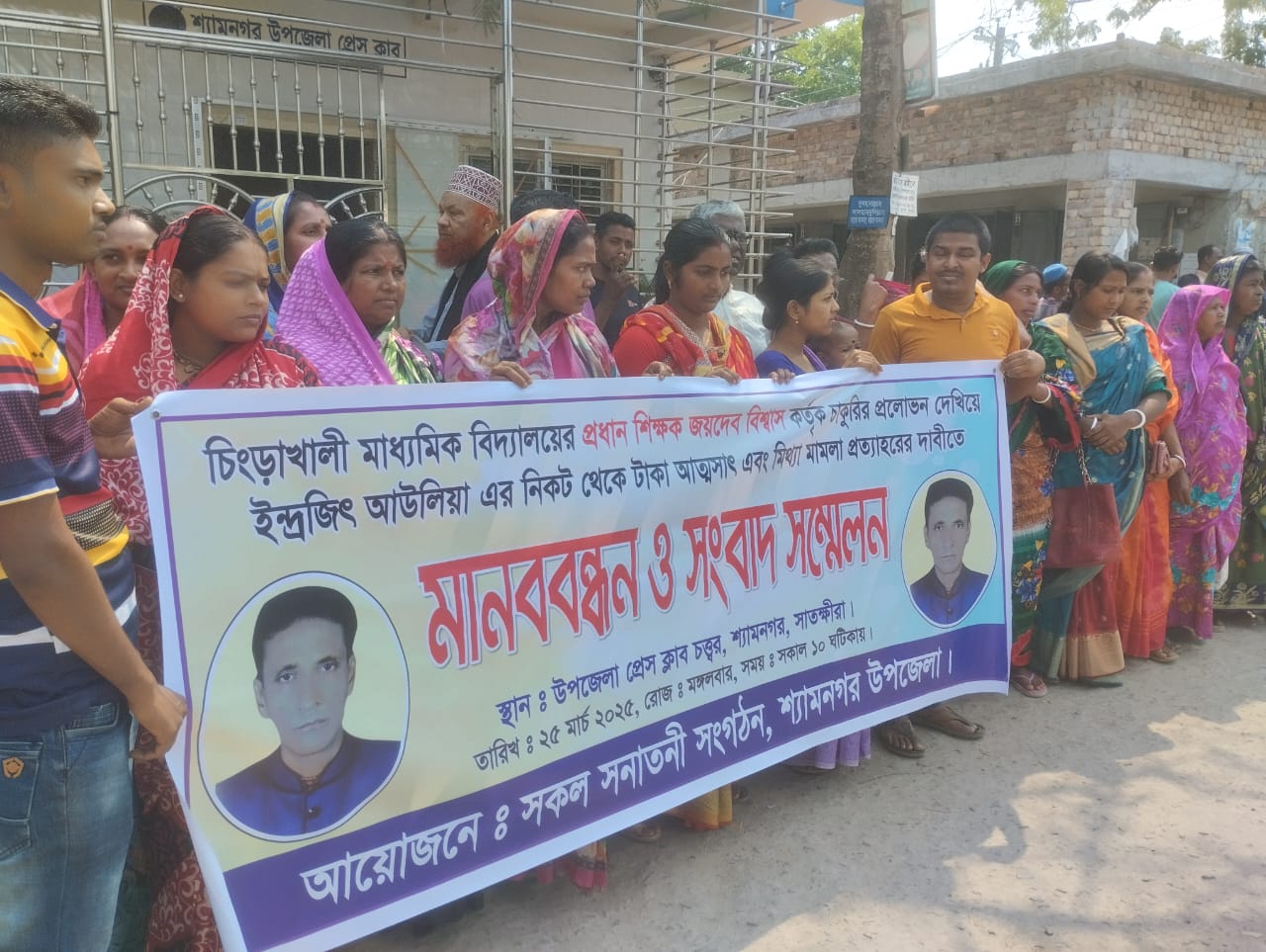 শ্যামনগরে হিন্দু বৌদ্ধ খ্রিস্টান পরিষদ, হিন্দু মহাজোট ও বাংলাদেশ হিন্দু কল্যাণ ফাউন্ডেশন, এর আয়োজনে ২৫ মার্চ সকাল ১০টায় উপজেলা প্রেসক্লাবের সামনে চিংড়িখালি মাধ্যমিক বিদ্যালয়ের প্রধান শিক্ষক জয়দেব বিশ্বাসের বিরুদ্ধে চাকুরীর প্রলোভন দেখিয়ে টাকা আত্মসাৎ ও মিথ্যা মামলা প্রত্যাহারের দাবিতে মানববন্ধন অনুষ্ঠিত হয়।