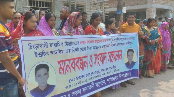 শ্যামনগরে হিন্দু বৌদ্ধ খ্রিস্টান পরিষদ, হিন্দু মহাজোট ও বাংলাদেশ হিন্দু কল্যাণ ফাউন্ডেশন, এর আয়োজনে ২৫ মার্চ সকাল ১০টায় উপজেলা প্রেসক্লাবের সামনে চিংড়িখালি মাধ্যমিক বিদ্যালয়ের প্রধান শিক্ষক জয়দেব বিশ্বাসের বিরুদ্ধে চাকুরীর