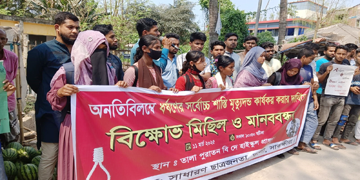 তালায় ধর্ষণের সর্বোচ্চ শাস্তি মৃত্যুদন্ড কার্যকর করার দাবিতে বিক্ষোভ মিছিল ও মানব বন্ধন করেছে সাধারণ ছাত্র-জনতা। মঙ্গলবার (১১ মার্চ) সকাল ১১ টায় তালা পুরাতন বিদে হাইস্কুল মাঠ থেকে শুরু হয়ে